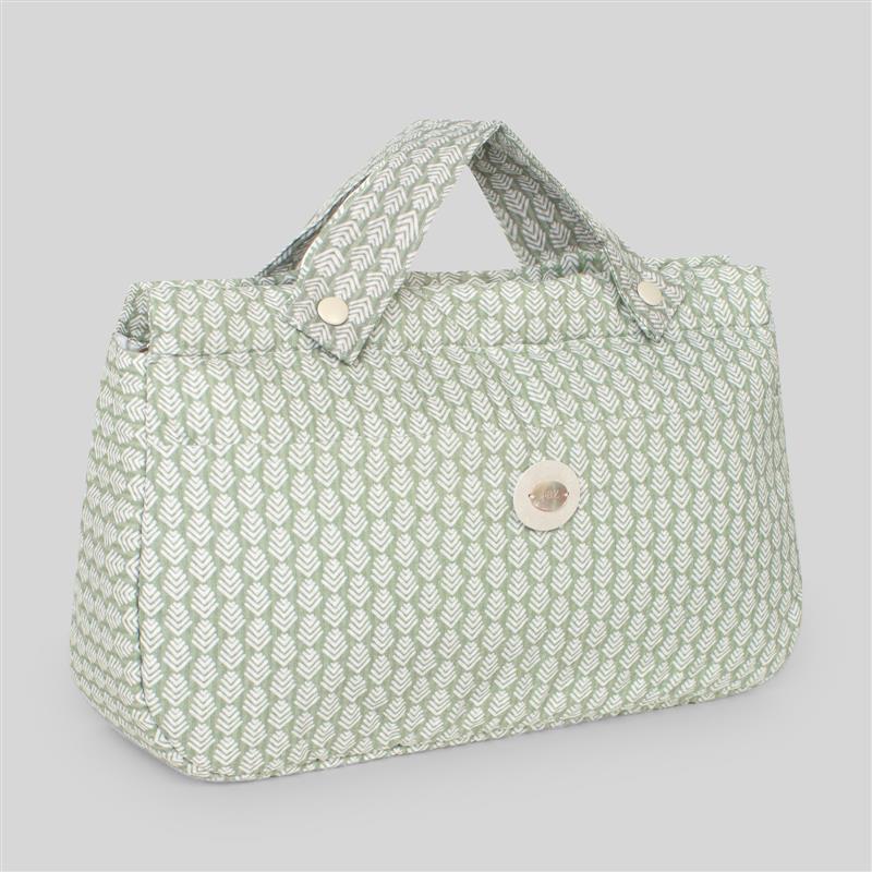 Bolso tipo panera de seersuker estampado geométrico lotos. Ideal para llevar todo lo necesario para el bebé. Puede colgarse en la silla del bebé. Incluye asa bandolera.
