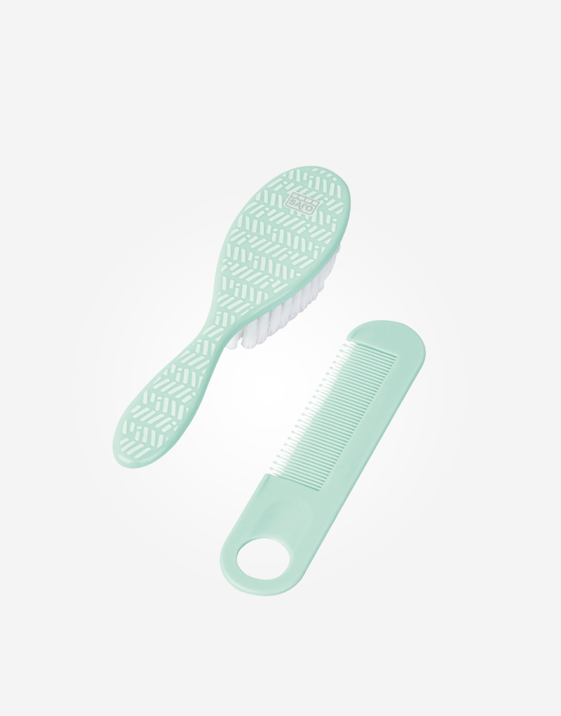 Un set de dos piezas, perfecto para el cuidado diario del bebé. Se compone de un cepillo de cerdas sintéticas y un peine con púas redondeadas para mayor seguridad del bebé.