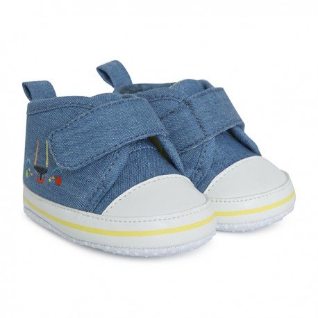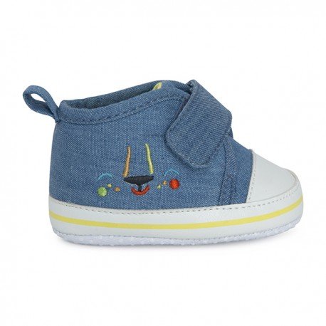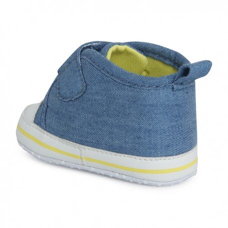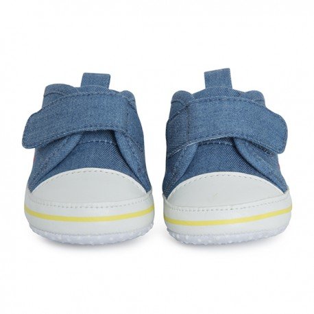 Deportivas denim de bebé niño en azul con velcro y detalle carita de la colección Hi! Sunshine