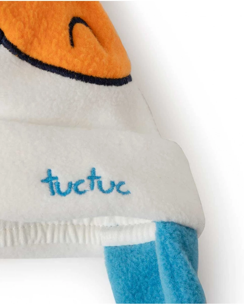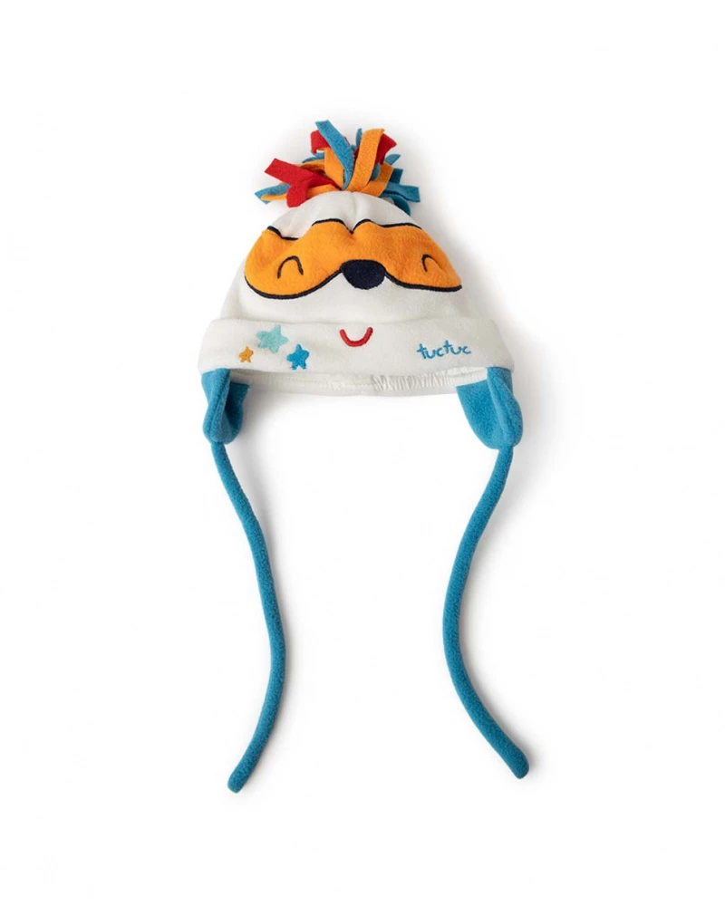 Gorro polar de niño color blanco con estampado de animalito y pompón.