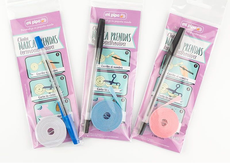 Cinta Marca Prendas termoadhesiva. Etiquetas personalizables para ropa, disponible en tres colores: blanca, azul y rosa.