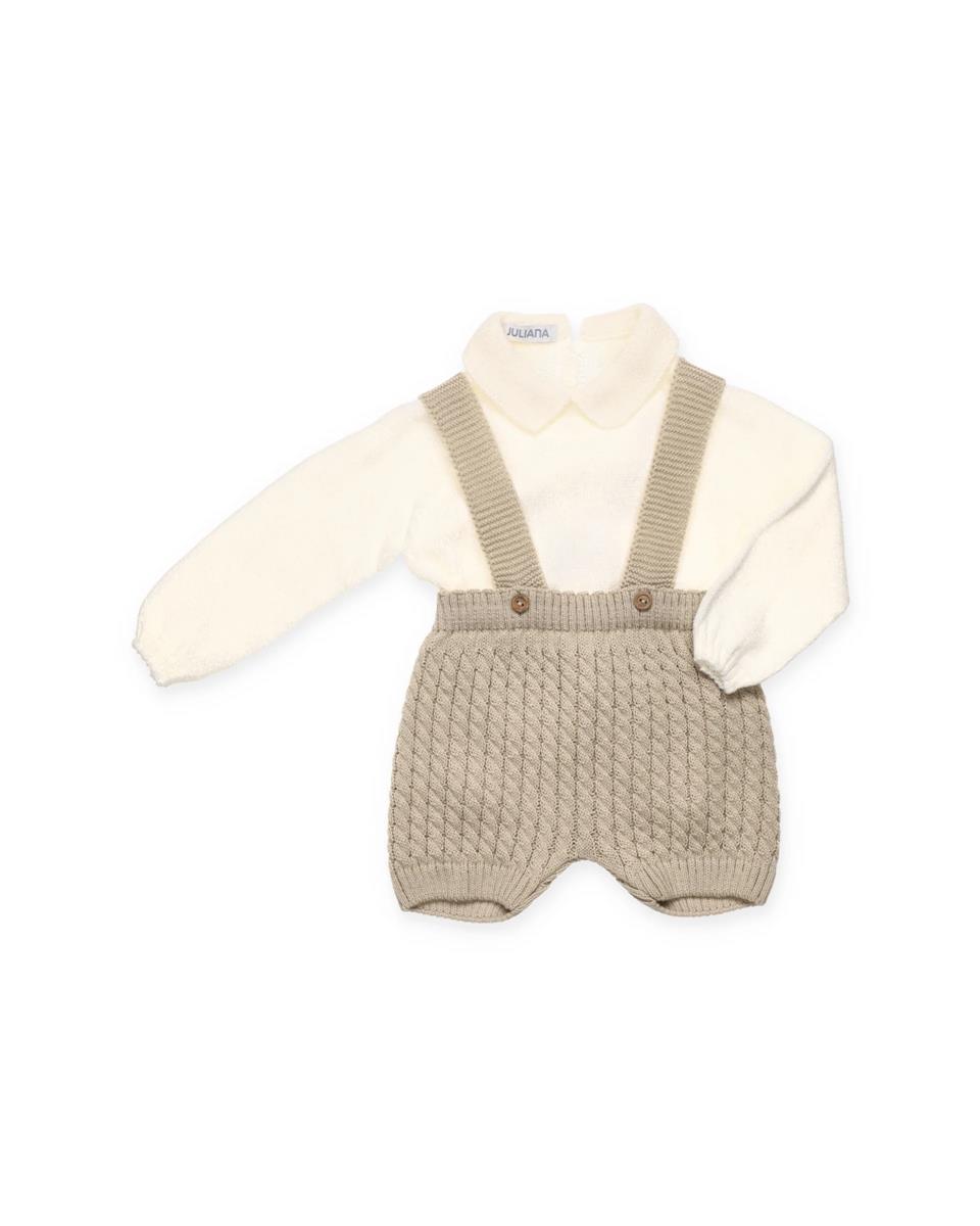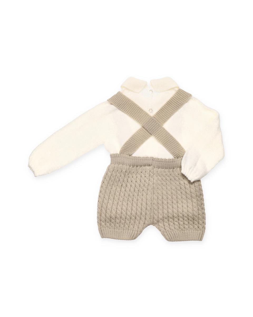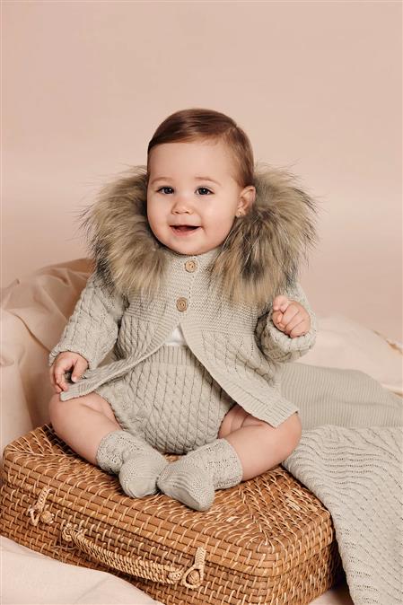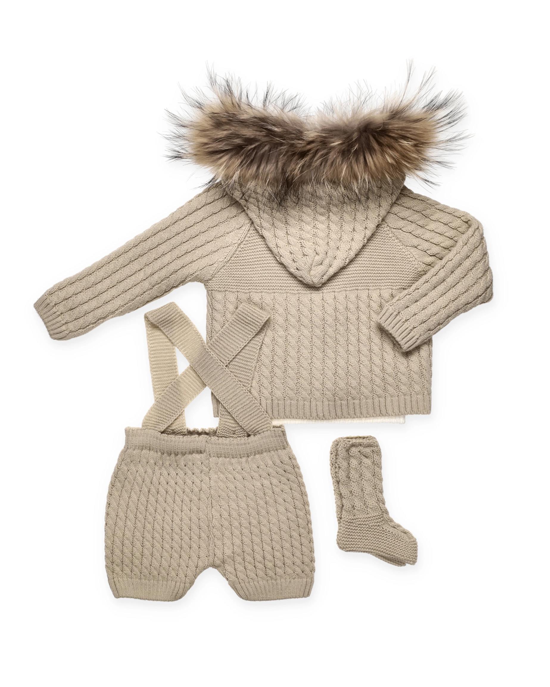 Conjunto de punto tricot compuesto por jersey con cuello pico, chaqueta con capucha rematada con pelo sintético desmontable, cierre con botones y dibujo de trenzas y peto corto a juego con tirantes cruzados y botones. Incluye botitas de punto coordinados.