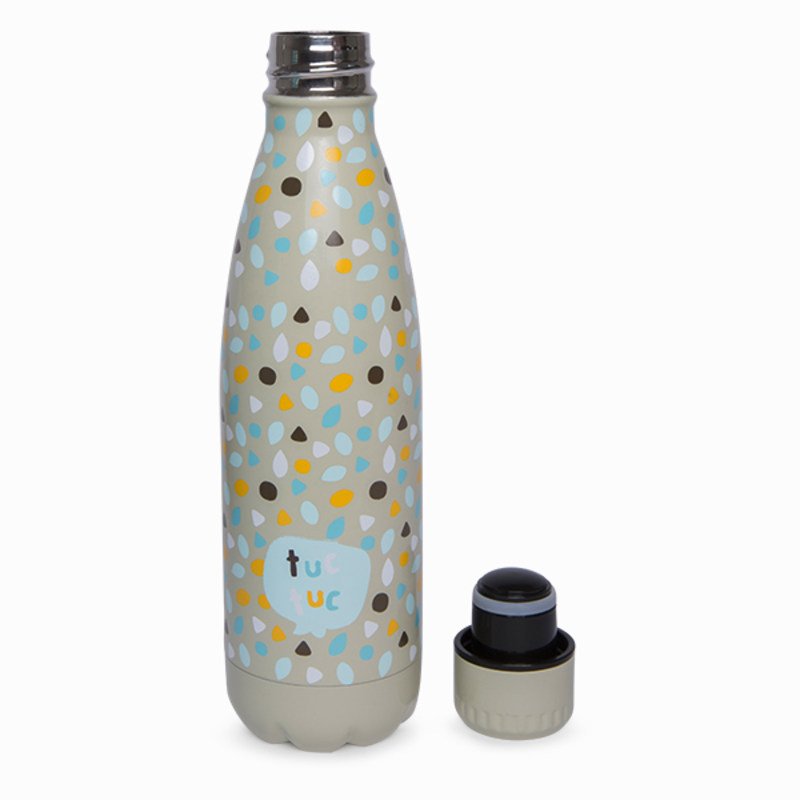 Botella de acero inoxidable apta para alimentos. Doble pared. El interior y el exterior son de acero inoxidable de alta calidad sin ningún vidrio, por lo tanto irrompible. La inserción es de acero neutro de alta calidad con una superficie lisa, higiénica y fácil de limpiar.