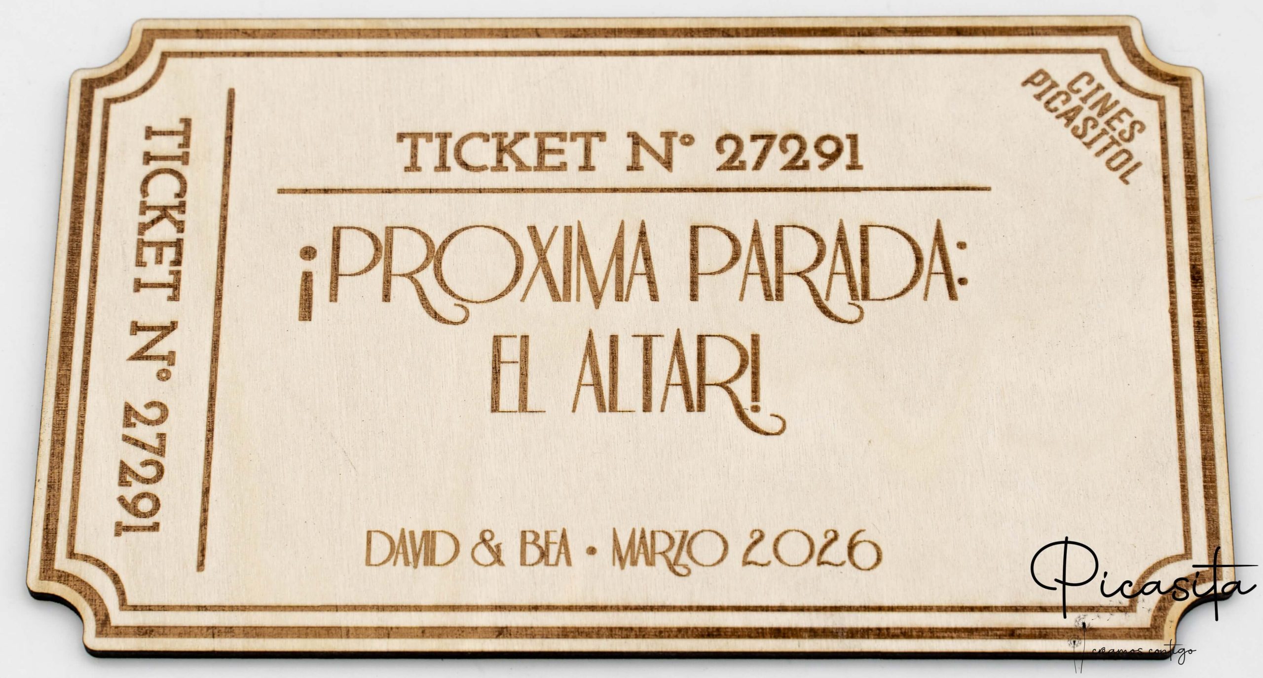 Este regalo se aleja de lo predecible. En lugar de un objeto que puede acabar guardado, ofreces una pieza decorativa que seguramente encontrará un lugar destacado en su hogar. Cada vez que lo vean, no solo recordarán vuestra boda, sino también la emoción de saber que sois los siguientes. El mensaje, grabado a fuego en la madera, se convierte en un recordatorio constante y positivo de la emocionante etapa que están a punto de comenzar.