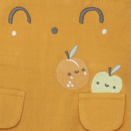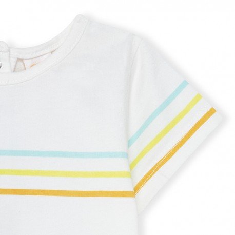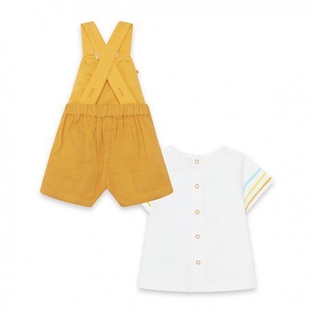 Conjunto peto y camiseta de bebé niño. Peto gasa naranja con tirantes cruzados en espalada y detalle carita y camiseta blanca de manga corta con detalle 3 rayas de la colección Picnic Time