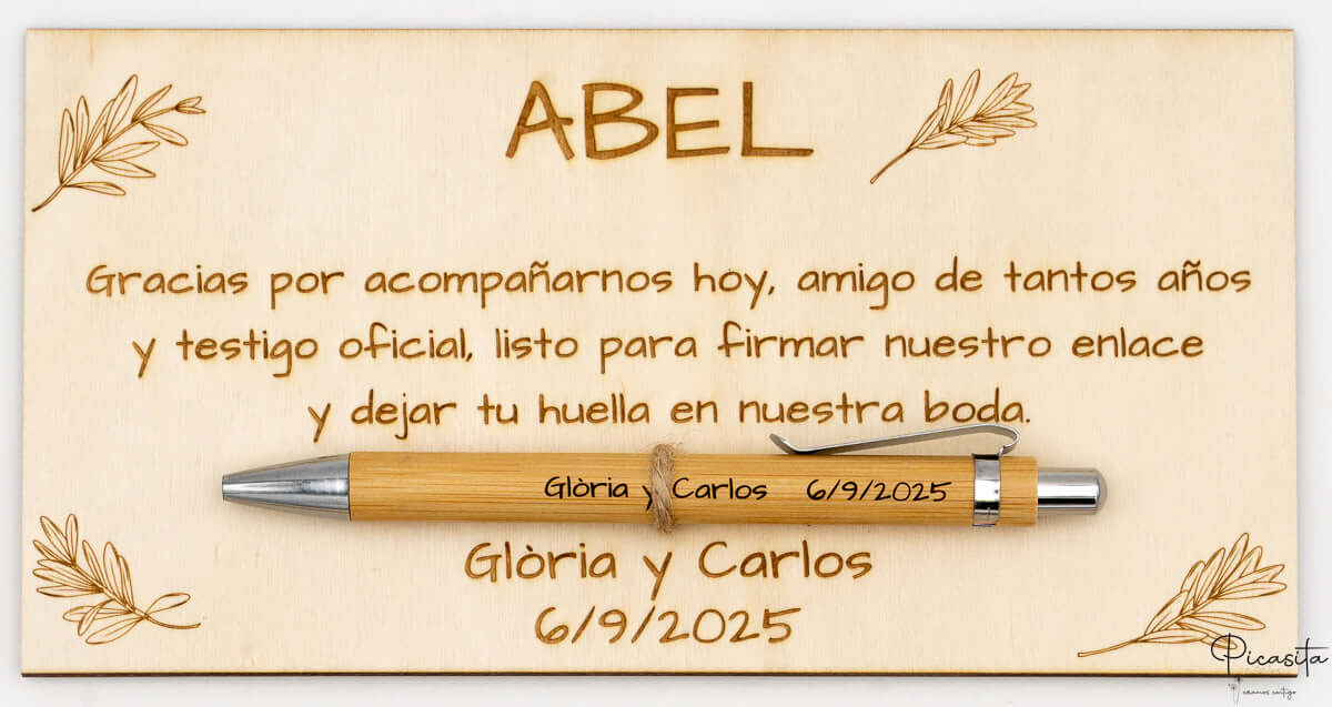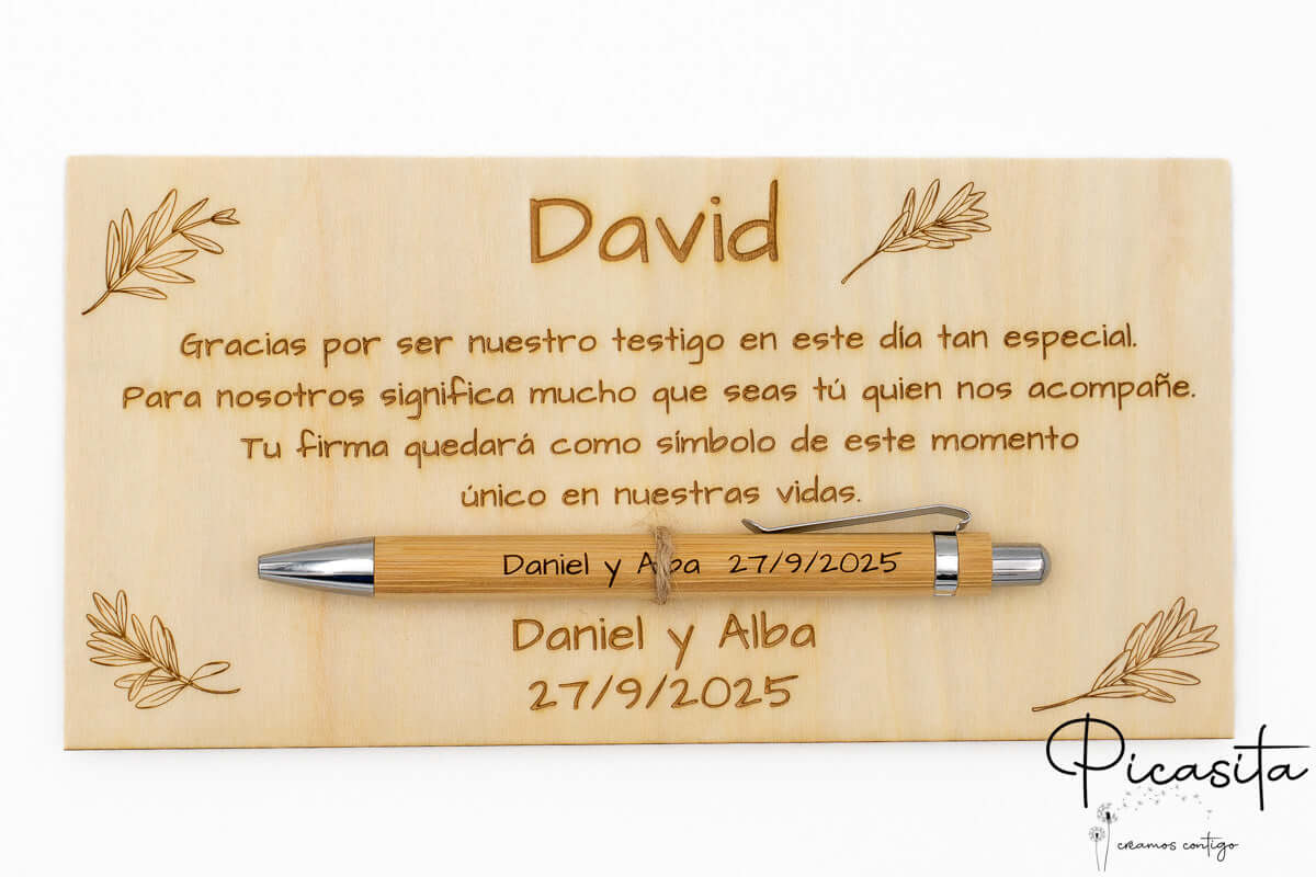 Respuesta: La personalización es muy completa. En la placa de madera puedes grabar el nombre de tu testigo y escribir un mensaje de agradecimiento totalmente a tu gusto. En el bolígrafo de bambú se graban los nombres de la pareja y la fecha de la boda.