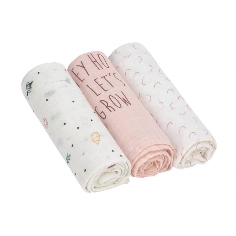 Pack de 3 muselinas 100% algodón especialmente respetuosas con la piel del bebé. Son de una sola capa y de medida mediana, perfectas como mantita fina.