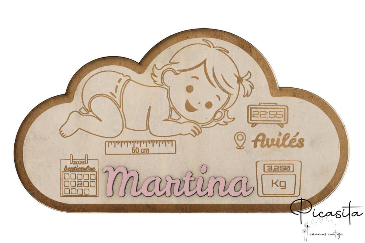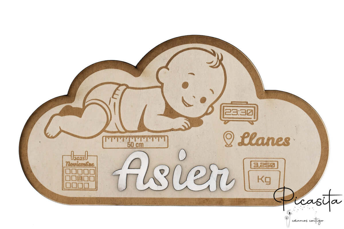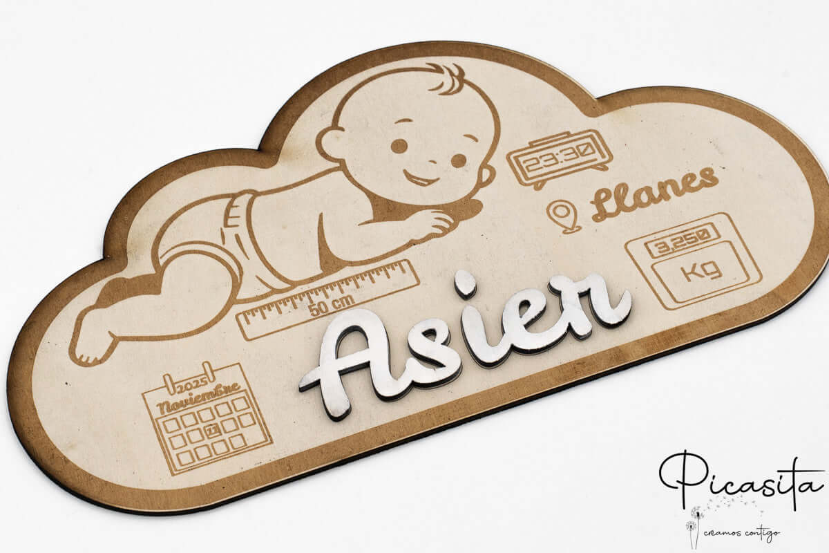 Imagina poder tener a la vista, día tras día, todos esos datos que un día fueron tan esperados y ahora son un tesoro. Nuestro natalicio de madera está meticulosamente diseñado para grabar la información más relevante del nacimiento. En la capa inferior, con su delicada forma de nube, se inscribe con precisión el nombre completo del bebé, la fecha exacta de su llegada al mundo grabada en un calendario detallado, su peso al nacer, su medida y el lugar de nacimiento. Cada uno de estos detalles se incorpora con una claridad y una belleza que solo el grabado láser puede ofrecer.