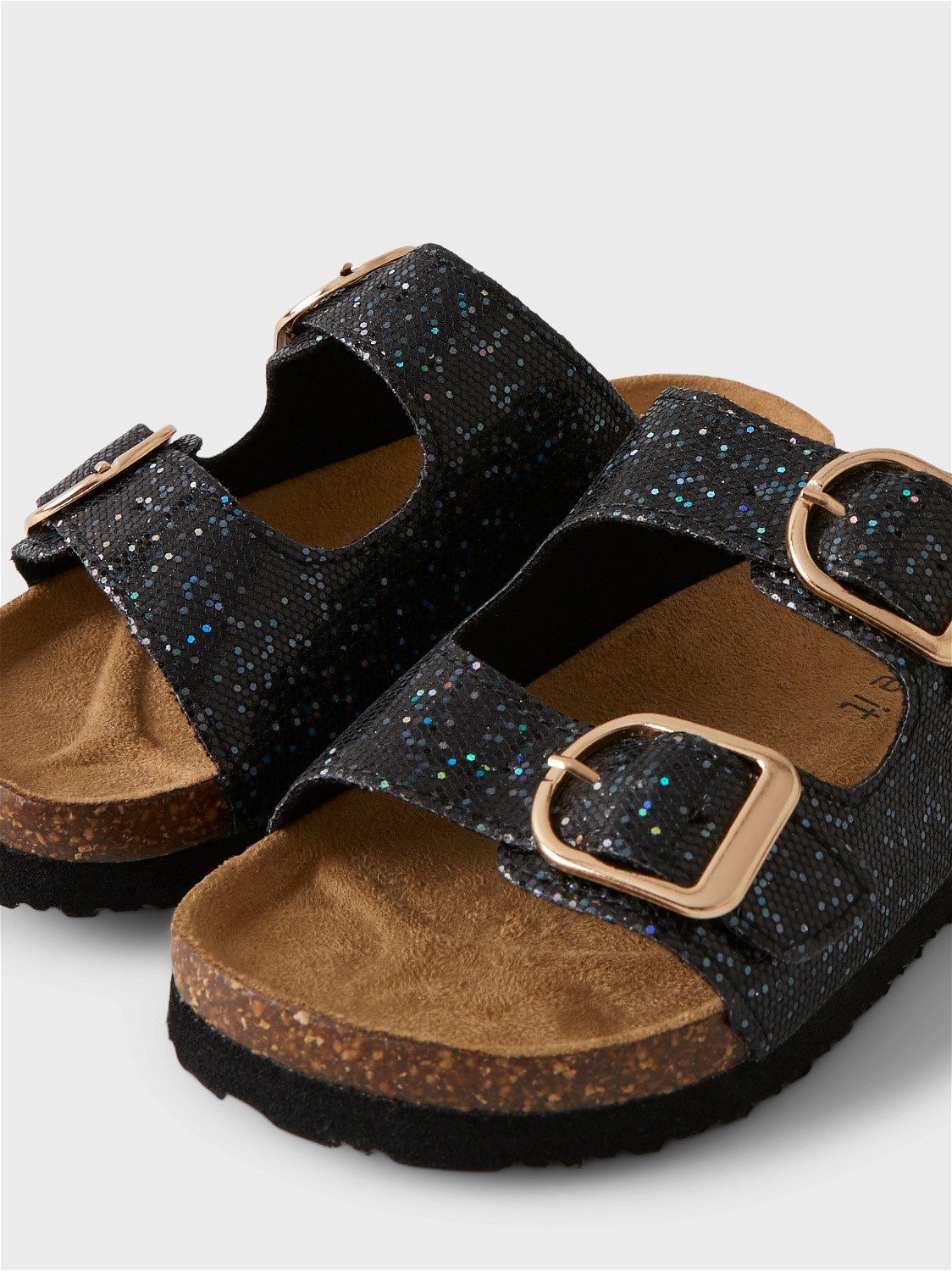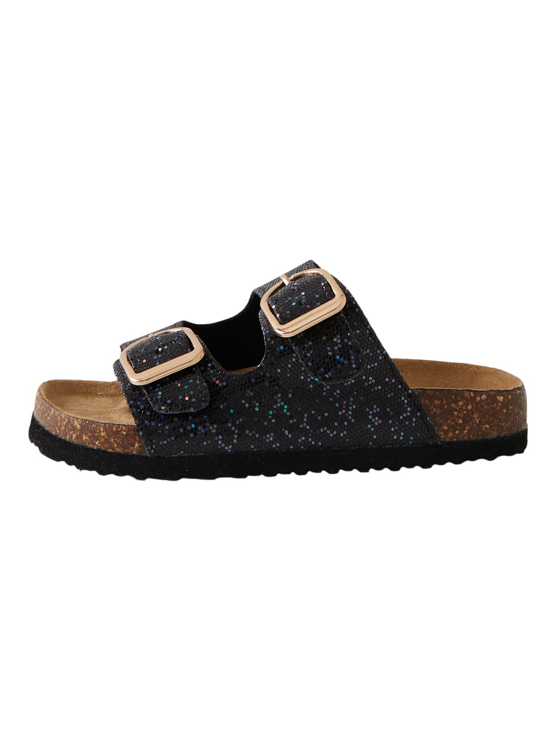 Bonita Sandalia en color negro brillantina, con dos hebillas.