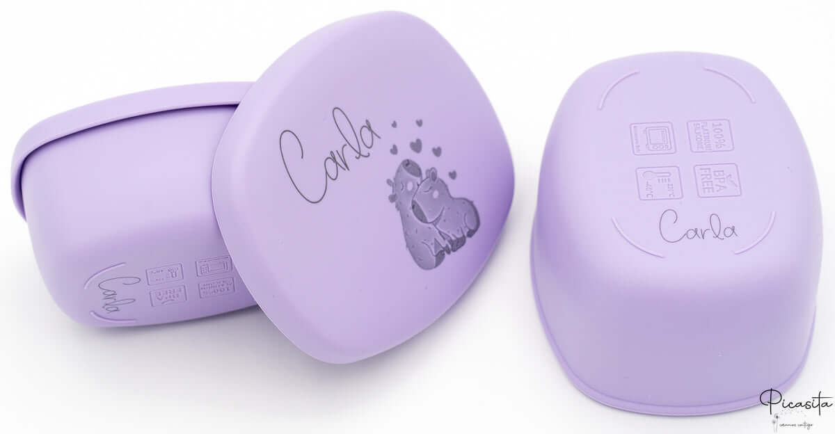 El proceso de grabado con láser es permanente. No es una pegatina ni una tinta que se desvanece con los lavados o el uso. La personalización se funde con la silicona, resistiendo el lavavajillas, el microondas y el paso del tiempo. Puedes elegir grabar el nombre en ambos recipientes o, si lo prefieres, podemos grabar el nombre en uno y un simpático animalito o icono en el otro. Es una forma fantástica de darle un toque único y divertido que a tu hijo le encantará, haciendo de este tuper personalizado su favorito.