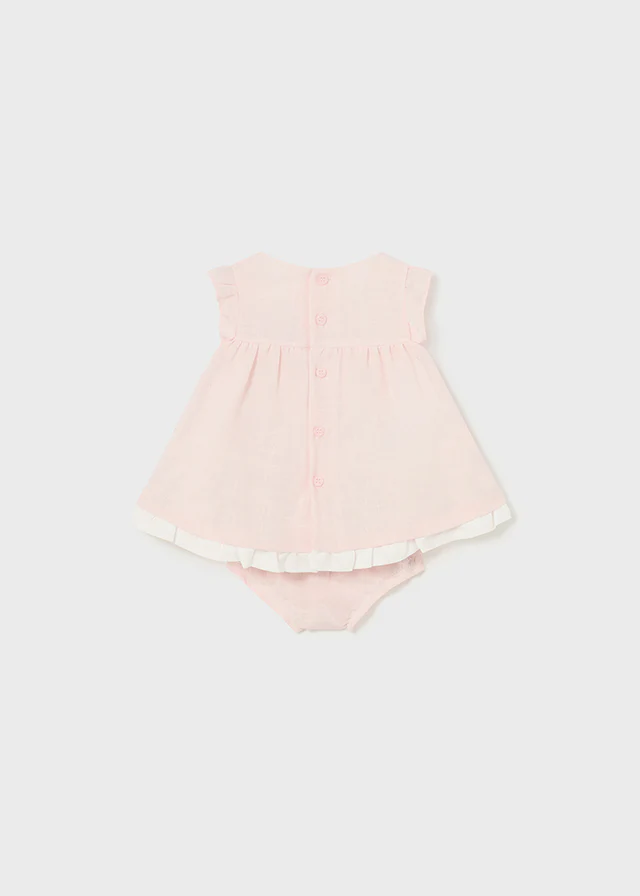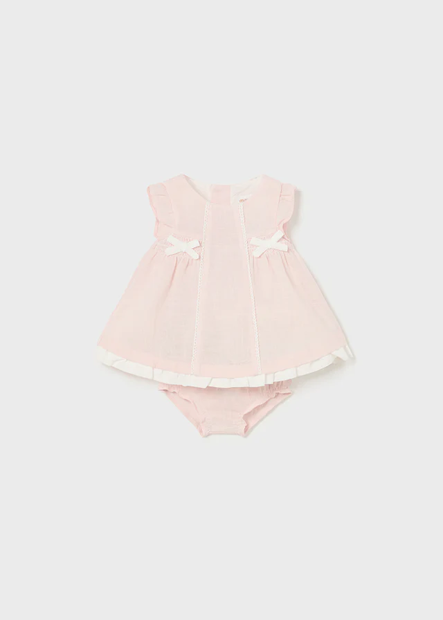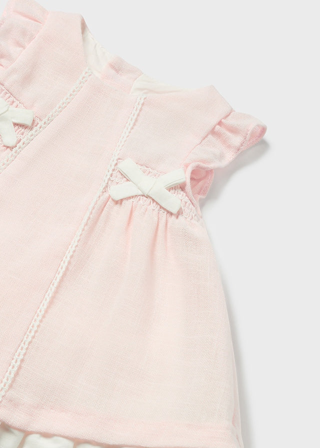 Vestido de manga corta para recién nacido con detalles de holanes. Cuello redondo. Cierre con botones en la espalda para facilitar la puesta de la prenda. Elementos de adorno: apliques de moños.